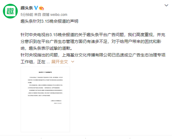 针对中央电视台 3.15 晚会报道的关于趣头条平台广告问题,我们高度重视,并充分意识到在平台广告生态管理方面仍有诸多不足,对于给用户带来的困扰和影响,趣头条表示诚挚的道歉。针对央视指出的问题,上海基分文化传播有限公司已迅速成立广告生态治理专项工作组, 正在对平台涉及的广告进行全平台彻查,一旦发现相关问题,坚决严厉清查和封禁。我们高度重视平台的广告内容生态管理,非常感谢央视等媒体及社会各界的监督和批评, 上海基分文化传播有限公司将会负责到底,同时也欢迎广大媒体给趣头条提出建议和意见, 我们会不断进行自我完善,继续为广大用户做好内容服务。
