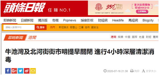 据香港《头条日报》等多家港媒报道,香港食物环境卫生署今日(16日)宣布,因近日有新冠肺炎确诊病例与牛池湾街市以及北河街街市有关,食环署决定将于明日(16日)提早1小时于下午7时关闭,以进行深层清洁消毒工作。