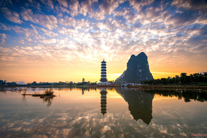 柳江区柳江岜公塘湿地公园内,朝霞绚丽,彩云满天。潋滟的水光山色中,拱桥与湖水相映衬,远山合绿树与湖水深情环抱,散落四周的独秀峰则像是棋盘里的棋子,生动地点染着这片山水画卷。(柳江区纪委监委 韦善信摄)