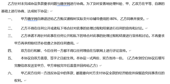对于绿色直通车一事,有学员也向记者表达了和律师相近的观点,“就是给你退一部分,让你息事宁人认倒霉别吭气”。该学员还提供了嗨学网的和解协议。