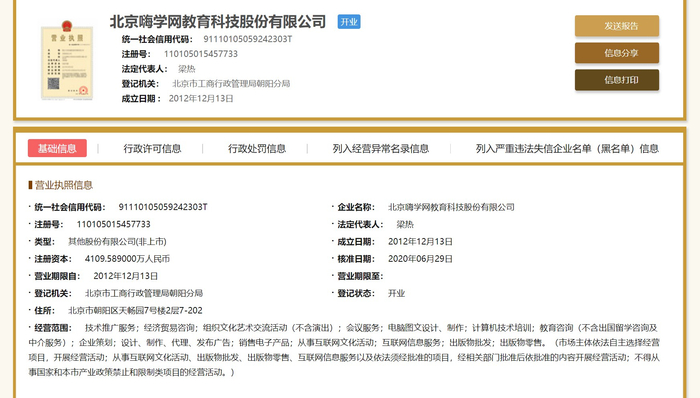 嗨学网曾于2018年10月8日被北京市工商行政管理局朝阳分局列入经营异常名录,原因是“公示企业信息隐瞒真实情况、弄虚作假的”,不过,同年11月16日便被移出名录。