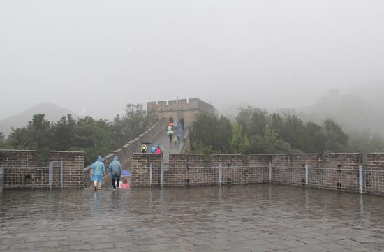 7月17日,京郊迎来阵雨,朦胧雨雾中,八达岭长城宛如一条巨龙,驾雾而行。雨水并没有消退游人的登城热情,远道而来的游客们或打起五颜六色的雨伞,或身披色彩缤纷的雨衣在长城上前行,仿若一条绚丽的彩带。 “疫情向好终于可以出门走走了,这是我第一次来八达岭长城。景区各项防控措施很到位,景色壮丽宏伟,是难忘的一天。”来自山东的一位游客说。
