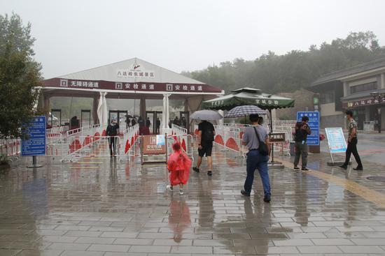 游客玩的尽情尽兴,离不开景区的各项保障。为保证游客的健康安全,打造良好的游览环境,八达岭景区各项疫情防控措施毫不松懈:安检通道对游客进行体温监测,并查看“健康宝”,确保进入景区的每位游客身体没有异常;景区内餐饮经营单位及商铺定时消毒。 正值汛期,景区也全面加强了防汛措施,全力保障广大游客生命财产安全和景区文物设施安全。