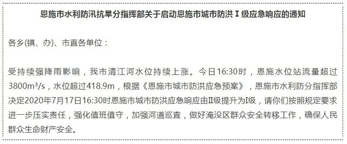 今日16:30,恩施水位站流量超3800m³/s,水位超过418.9m。湖北恩施水利防汛抗旱分指挥部发布通知,决定自今天16:30起将恩施城市防洪应急响应由II级提升为I级。