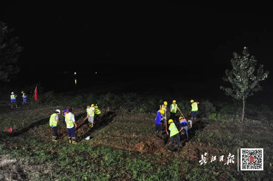 7月17日晚,武汉东西湖区东风垸堤出现散浸。现场的防汛人员在堤坡浸润线以下开挖导渗沟,排除渗水。记者 彭年 摄