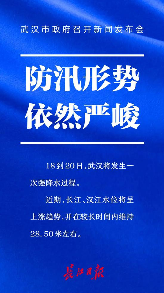 市防办通报,长江2020年第2号洪水已经形成,气象预测18到20日,武汉市将有一次强降水过程发生,近期长江、汉江水位将呈上涨趋势,并在较长时间内维持28.50米左右波动,防汛形势严峻。