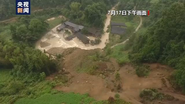 7月17日中午,在兴隆镇朝天门村松木溪,山上滑下的大量泥土已经将河道堵塞,洪水从村民的房屋中流过,一些木质结构的房屋墙体已经被洪水冲走,山上仍有少量泥土往下滑落。