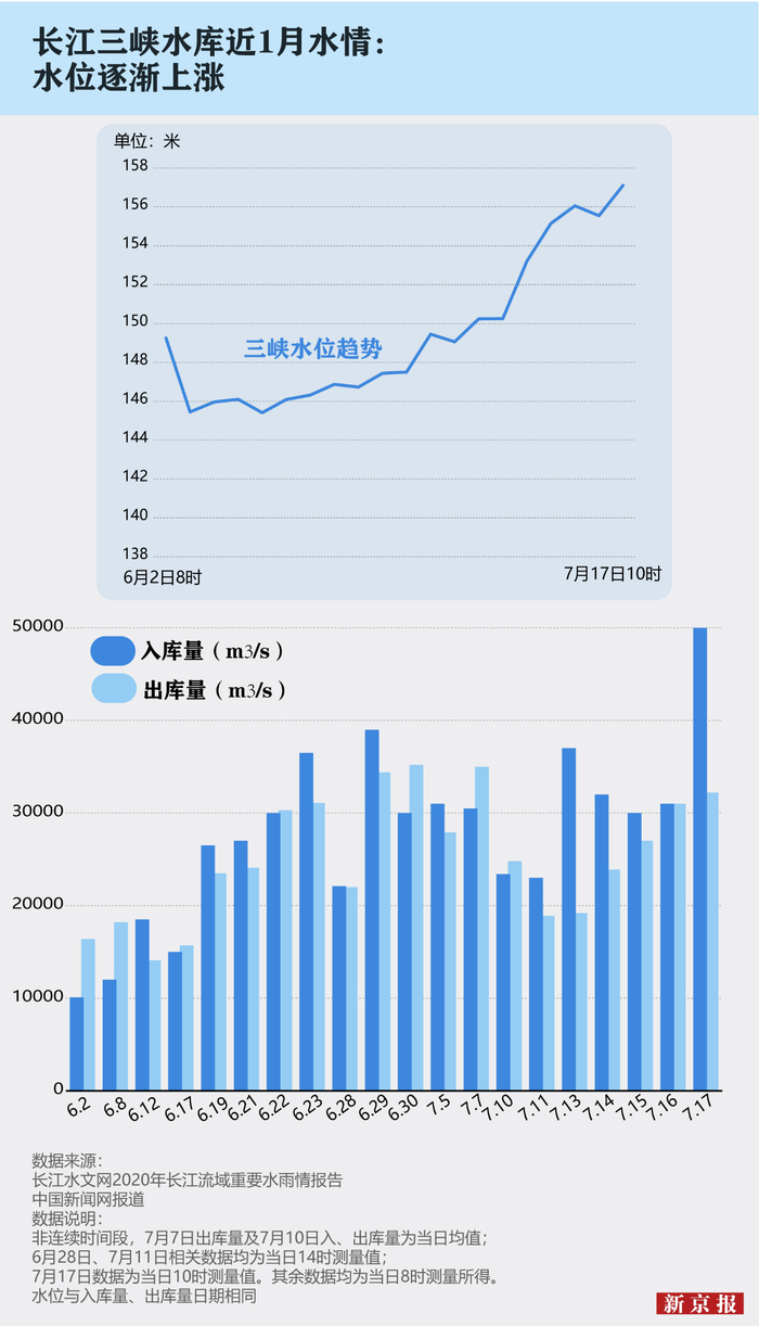 自6月初以来,三峡水库水位一直波动上涨。受到长江上游流域金沙江、嘉陵江、乌江和三峡区间等区域强降雨影响,三峡水库入库流量快速上涨,从7月15日20时的28100立方米/秒、17日10时的超过50000立方米/秒,到截至7月18日8时,长江三峡大坝水位已高达160.17米,入库流量为每秒61000立方米,出库量为每秒33000立方米。