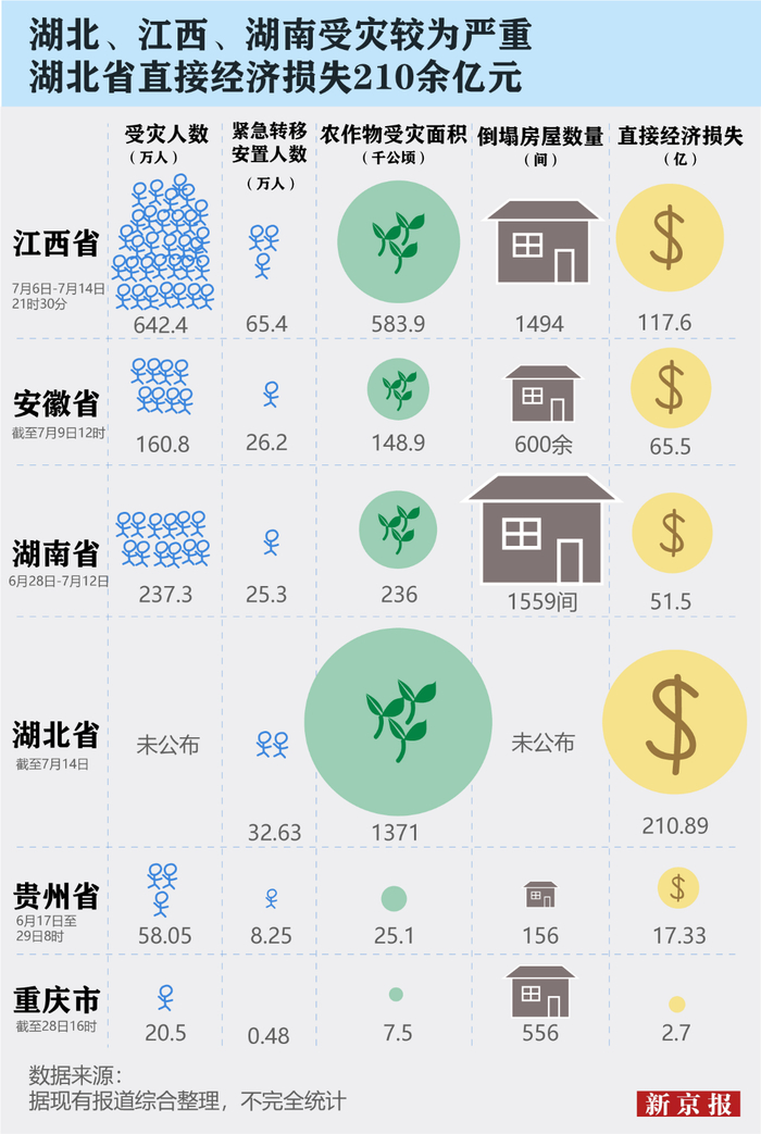 湖北省农作物受灾面积最大、经济损失最为严重,截至7月14日,全省已有超1371千公顷农作物受灾,其中绝收面积188.813千公顷,据初步统计经济损失达210.89亿元。