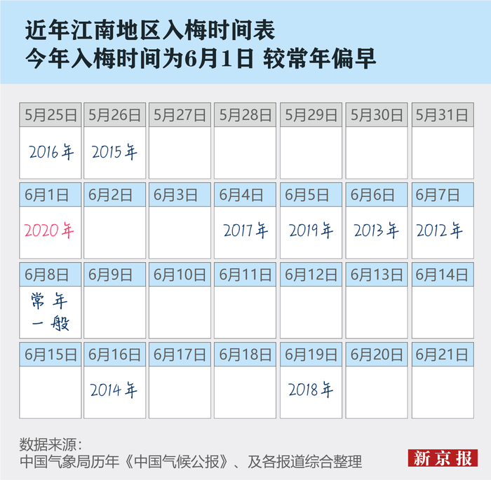 1951年以来,我国梅雨季节常年6月8日入梅,7月18日出梅。2012年-2020年,江南地区入梅时间大多早于6月8日,最早日期为2016年的5月25日,与1995年并列史上最早;近年来,仅2014年和2018年两年晚于常年。