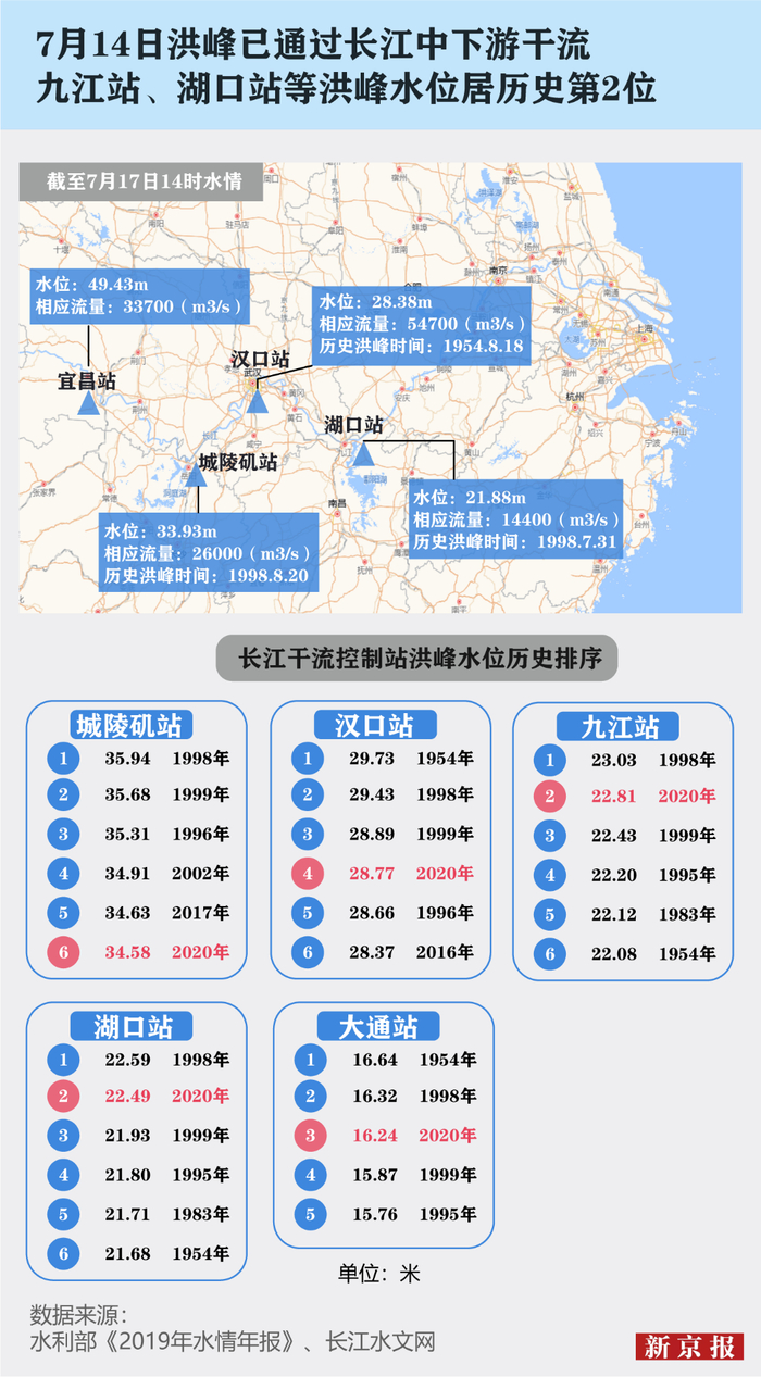 长江以湖北省宜昌、江西省湖口为界,分为上中下游。据水利部长江水利委员会水文局,截至7月14日,洪峰已经顺利通过长江中下游干流。九江站、湖口站等居历史水位第2位。
