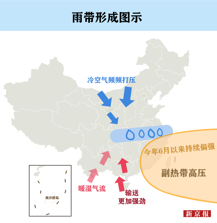 据了解,今年6月以来,副高比往年同期势力偏强,其外围的西南气流将来自孟加拉湾或我国南部海区的充沛水汽,输送到我国南方;同时,北方的冷空气活动也比较频繁,造成了冷暖空气在南方地区持续交汇的局面,由此导致强降雨过程频繁且持续发生。