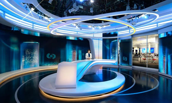 《新闻联播》新演播室N01总建筑面积约100㎡,是总台新闻中心高清改造工程中的重要演播室系统:包括1个站播区域和1个坐立播报区域,日常设置机位数为3个,日服务直播时长6小时;包括综合频道《晚间新闻》及新闻频道《午夜新闻》等节目均使用该演播区域。