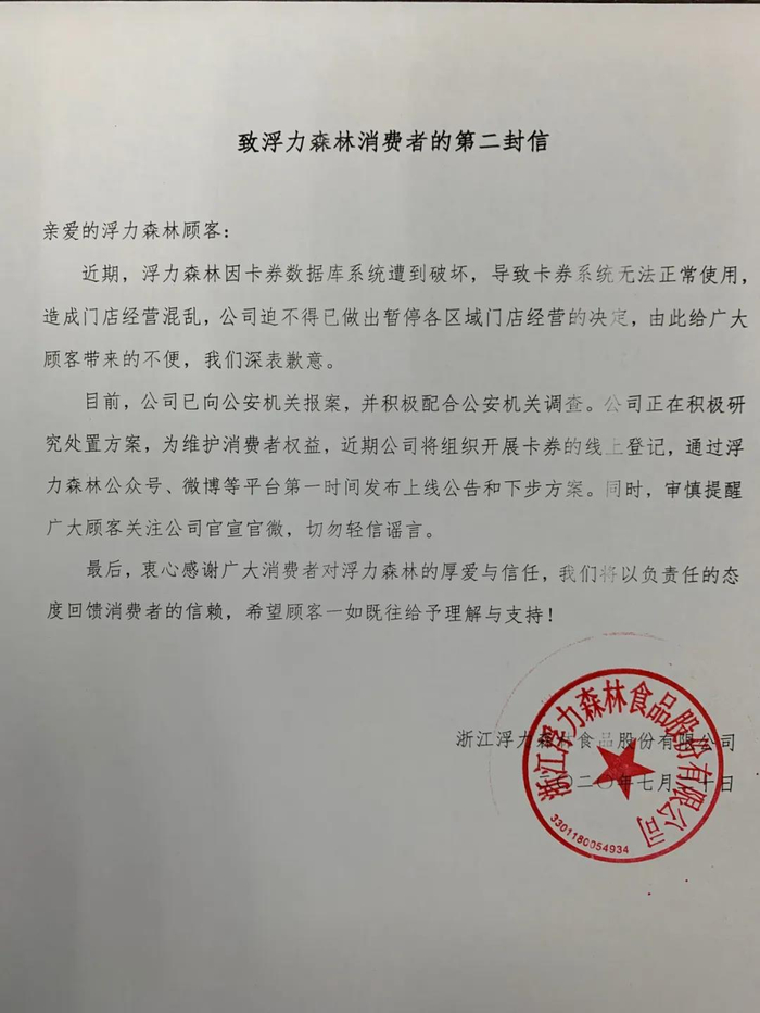 原标题:浮力森林再致信消费者,数据库遭破坏将组织卡券线上登记