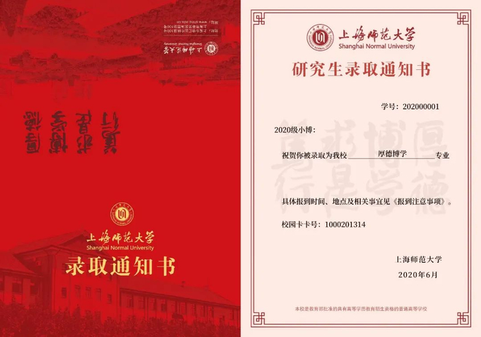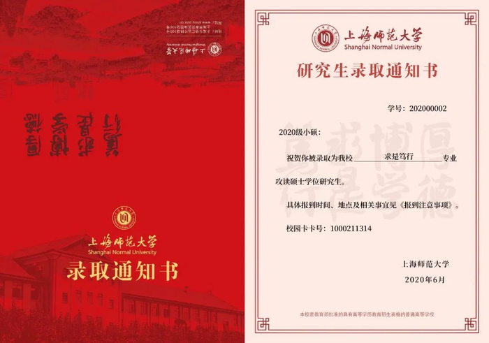 2020年上海师范大学研究生录取通知书,