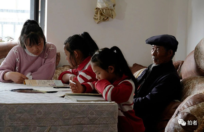 △2020年6月8日,毕节市威宁县五里岗街道朝阳社区,刘桂仙姐妹三人放学后在爷爷的陪伴下做作业。爷爷说,搬到县城后,学校条件好,离家近,上学路好走,孩子们学习成绩提高得也快。姐妹三人还获得了公益组织每人每年5000元的资助,该资助会一直持续到她们高中毕业。