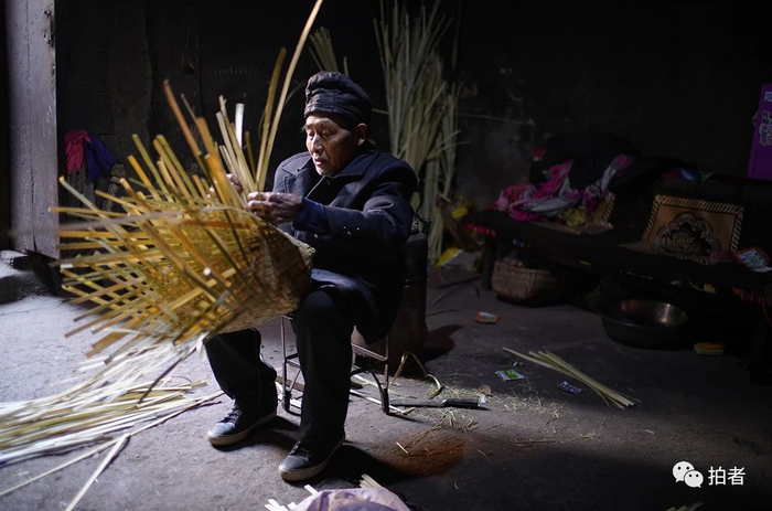 2019年2月24日,毕节市威宁县海拉镇花果村大石头组,行走不便的伍正明在家编织竹篓。他七十了,儿子在云南打工,患病的妻子跟着儿子在云南治病。村里留下的大部分是老人和孩子。他所在的大石头组又称“溜索村”,村民外出要不通过溜索跨过牛栏江出村,要不翻山越岭4个小时以上出村。大石头组不适宜人居,被纳入整寨搬迁到县城。对于部分不愿意搬迁的家庭,政府持续进行劝说工作。