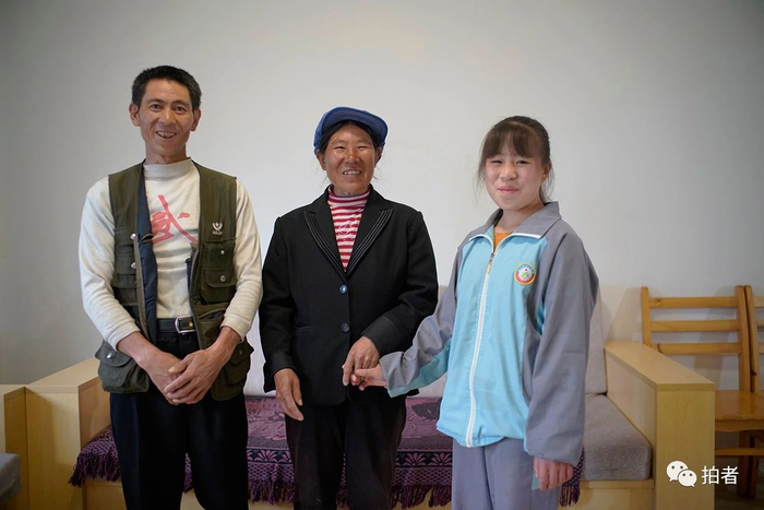 2020年6月8日,毕节市威宁县五里岗街道朝阳社区,卯春坊和父母在新家合影。卯春坊现在就读的中学离家徒步只要20分钟,她的姐姐在贵阳市就读职业学校。