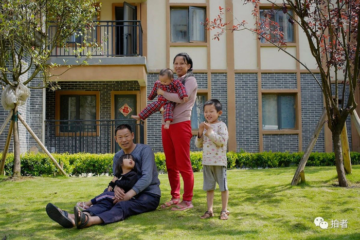 2020年6月6日,毕节市七星关区柏杨林街道幸福社区,宋善友夫妇带着3个孩子在新居前合影。迁入新居后,因妻子是精神障碍患者,且三个孩子还小,需要宋善友在家照顾,柏杨林街道依照相关政策,将宋善友一家5口人全部纳入城市低保。