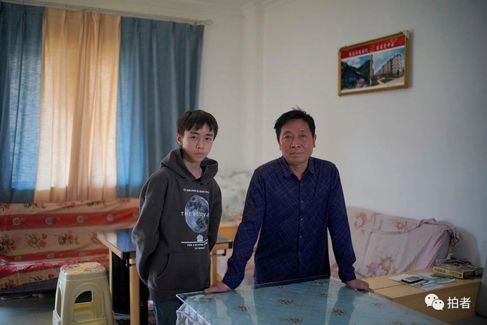 2020年6月6日,毕节市七星关区柏杨林街道幸福社区,汪育高和已经读初一的小儿子在新家客厅合影。他们的新家有120平方米,两个小儿子在离家不到500米的初中和高中就读,每天不到十分钟就能到校。汪育高和母亲都被纳入城市低保,老家的土地则按退耕还林政策给予他5年的现金补助。