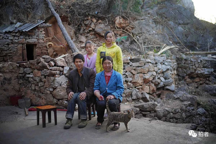 2019年2月24日,毕节市威宁县海拉镇花果村大石头组,卯春坊姐妹和父母一起合影。画面中,还有一家人喜爱的9岁土狗和1岁的猫。姐妹俩在海拉镇中学读书,每周往返一次,单程大约20公里,其中最为艰险的是大约7公里的梯子沟路,剩下的是水泥路,如果她们想取道相对容易的荒田沟,要多走2公里的水泥路。