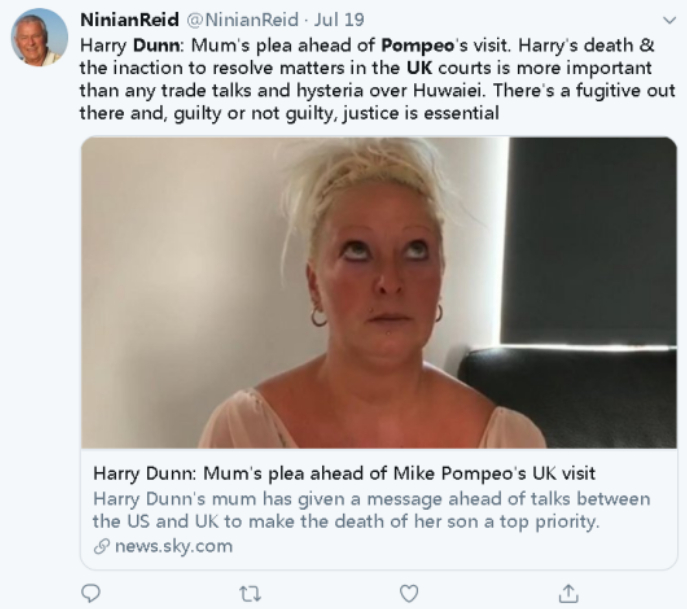网友:蓬佩奥此行前夕来自一个母亲的呼吁。哈里之死和英国法院的无能为力比任何贸易谈判和歇斯底里地对待华为都更为重要。这儿有个逃犯,到底有罪还是无罪,正义必不可少。