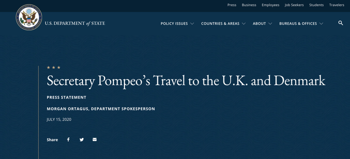 蓬佩奥又来欧洲了,7月20日至22日访问英国和丹麦。美国国务院网站上挂着他此次出访的议程。