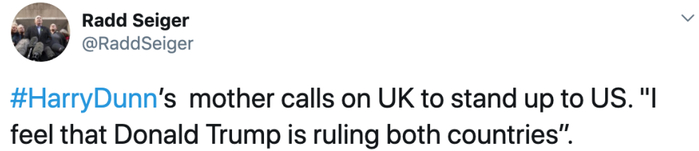 网友:哈里·邓恩的母亲是在呼吁英国在美国面前雄起,“我觉得特朗普统治了两个国家”。
