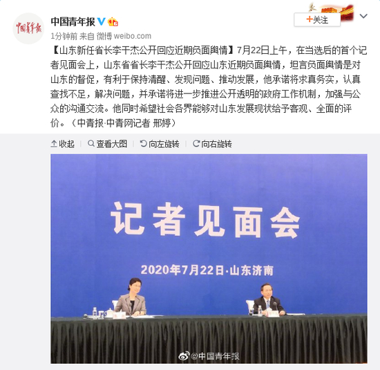 原标题:山东新任省长李干杰公开回应近期负面舆情