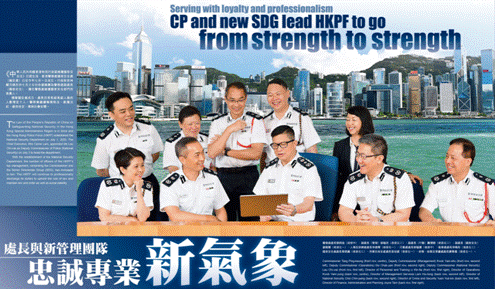 报道称,《警声》22日刊登一张香港警队高层人员大合照并介绍新管理团队,照片以“忠诚专业新气象”为标题,以维港为背景。警务处处长邓炳强坐在前排中央,三名副处长包括(行动)萧泽颐、(管理)郭荫庶、(国家安全)刘赐蕙均在前排,最右边是人事及训练处处长李建辉。