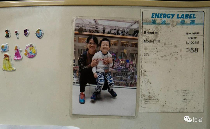 △冰箱上贴有黄凤和儿子刚到香港时的合影。