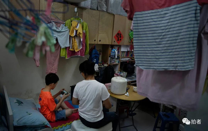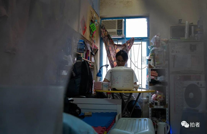房间进门便是卧室,摆放完基本家具和家电后,几乎没有多余的空间。这个总共不到10平米的劏房,每月租金3200港元(约2900元人民币),这已经是房东给出的最低价。由于黄凤是持探亲签注陪儿子在香港读书的,所以不能在这里就业,全靠有香港户籍的儿子每个月4620港元(约4100元人民币)的政府综合援助支付这笔费用。除去水电费和吃饭等基本开销,他们几乎没有结余。