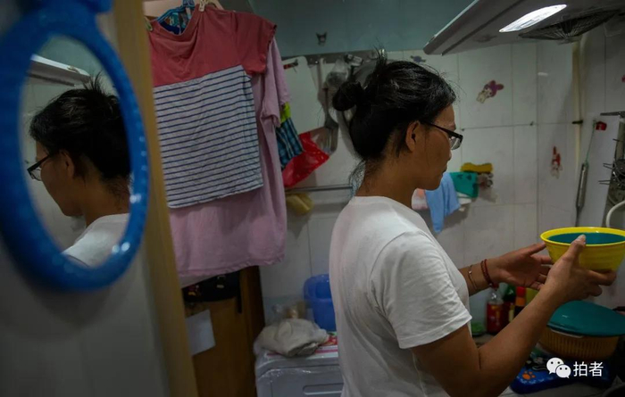 △黄凤坐在狭小的劏房里等待儿子放学回家。为了省钱,床和冰箱都是她和朋友自己搬上来的,洗衣机则是接受香港电台对社区贫困家庭的采访后,好心观众送的。这些家当就几乎塞满了整个屋子,她和儿子的生活物品被堆放在高高的壁橱里。
