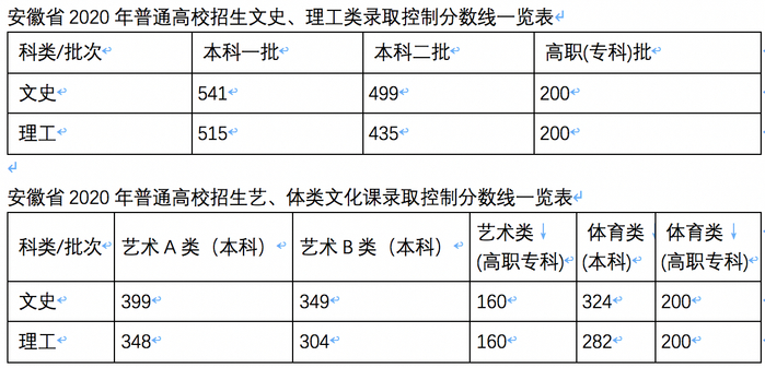 此外安徽省还公布了2020年普通高校招生艺、体类文化课录取控制分数线。需要说明的是,其中,艺术A类包括模块一(播音与主持艺术等)、模块二(广播电视编导、戏剧影视文学、戏剧学、电影学、艺术史论、艺术管理等)本科专业;艺术B类:除艺术A类以外的其他本科专业。