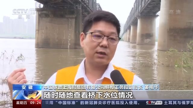 中国铁路上海局集团有限公司蚌埠工务段副段长 姜明华:加密检查,这个基本上做到两小时一遍。同时,利用监控手段,随时随地查看桥下的水位情况以及通航情况,采取停航限航措施。如果真上涨得还要严重,影响到梁体或者是支柱了,我们会采取相应的限速封锁,来保障铁路的安全,保障铁路运输的安全。