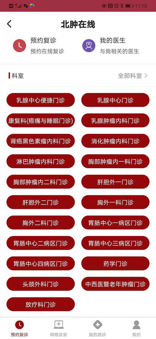 北京大学肿瘤医院介绍,复诊患者可通过“北肿云病历”APP预约挂号,在家看网络视频门诊,医生通过网络视频进行问诊,在线为患者开具检查、检验及处方,并通过“北肿云病历”把诊疗单和病历推送给患者,患者在线上完成缴费、预约检查日期,可以选择在线下到院做检查和取化疗药,也可以在当地医院完成后续医疗复查。互联网诊疗服务的开展,减少了患者就诊环节和非医疗花费支出,降低了院内交叉感染的风险。