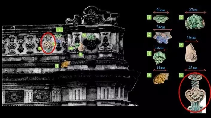 于是我们采集了琉璃构件的一些信息,根据西洋楼的老照片比对。西洋楼一共十多个建筑,还有桥、亭子等等,每个建筑有4个立面,还有立体的环廊等等,要找一个莴卷非常困难。我们耗费大量时间,终于在谐奇趣的一张照片上找到了很多琉璃构件的对应位置。进行色彩复原,发现原来整个建筑都是彩色的。