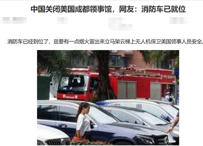 此前,曾有一张名为“美国领事馆关闭,消防车已就位”的图片在网上流传。不过,据特约记者表示,他在抵达现场时,并没有在附近街道看到图中这辆消防车。