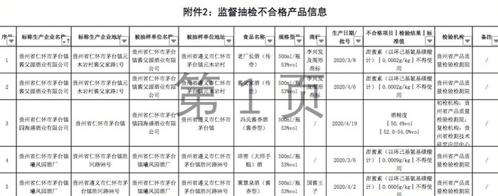 其中,贵州省仁怀市茅台镇酱父源酒业有限公司生产的酱父家酒(传世)以及老厂长酒(传奇)两款产品,存在甜蜜素(以环己基氨基磺酸计)不符合食品安全国家标准规定的问题;贵州省仁怀市茅台镇四海盛酒业有限公司生产的冯氏酱香酒(酱香型),存在酒精度不符合产品标签标示要求的问题;贵州省仁怀市茅台镇曦凤园酒厂生产的培窖(大师手酿)酒以及聚慧泉酒(酱香型)两款产品,存在甜蜜素(以环己基氨基磺酸计)不符合食品安全国家标准规定的问题。