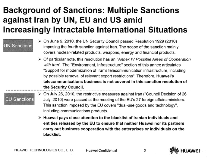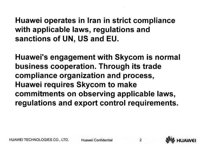 根据南华早报之前的报道,孟晚舟在与汇丰银行高管会面时,如实陈述了华为在伊朗的业务。孟晚舟的PPT用大量篇幅介绍了华为和Skycom在伊朗的客户、产品、合规要求、合规制度。其中还特别强调,在2010年7月1日美国总统奥巴马签署制裁伊朗法案后,华为高度重视,不仅自身严格遵守,同时要求合作伙伴必须合规。