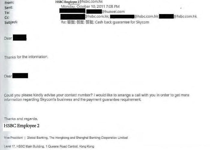 华为向法院提交的邮件也证实:汇丰不同区域、不同业务、不同层级的员工,包括“副总裁”和“高级副总裁”都在和华为直接沟通Skycom的银行业务。