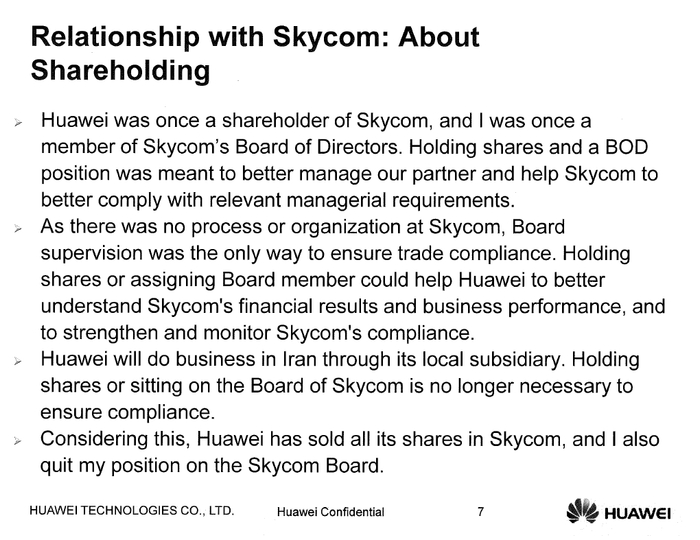 华为在这份PPT中介绍,Skycom是华为在伊朗地区的合作伙伴,华为曾持有该公司的股份,孟晚舟也短暂担任过该公司的董事。但早在2007年,华为便出售了所持有的Skycom的全部股份,2009年4月,孟晚舟辞去该公司董事会职位。