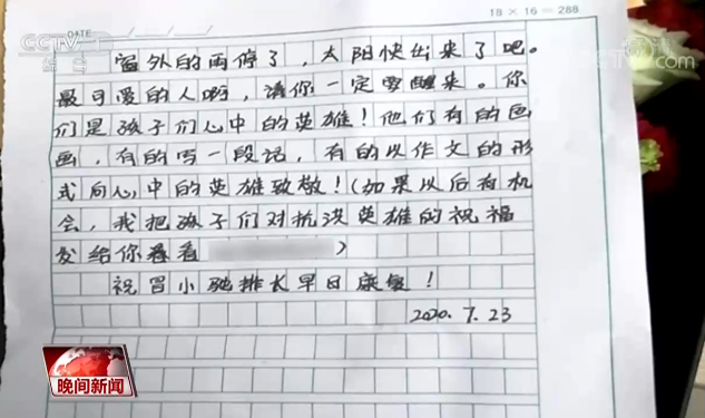 得知儿子受伤后,父母紧急从老家赶了过来。在洪水中并肩作战的战友,也写下心里话带给他,希望他能早日归队。看到大家的心意,冒小驰举起右臂敬了个军礼,久久不愿放下。病房外,群众带来了鲜花看望,也留下了真诚的祝福:“窗外的雨停了,太阳快出来了,你们是孩子们心中的英雄!祝愿早日康复!