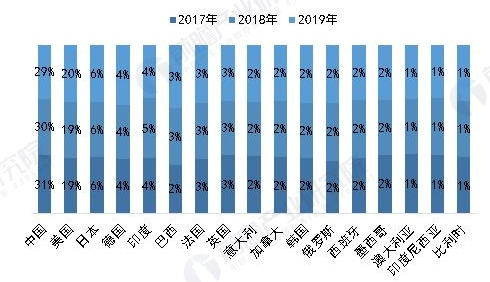 2017-2019年全球主要国家汽车销量市场份额(%)