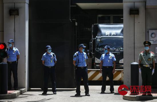 7月25日18时许,多辆物资运输车驶离美国驻成都总领事馆。