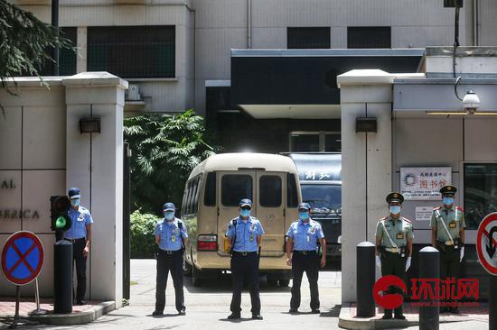[环球时报-环球网报道 记者崔萌]2020年7月26日,四川成都。一辆中巴驶入美国驻成都总领事馆,领馆安保开门时严加防范。可以看到搬家公司车辆停放在院内。