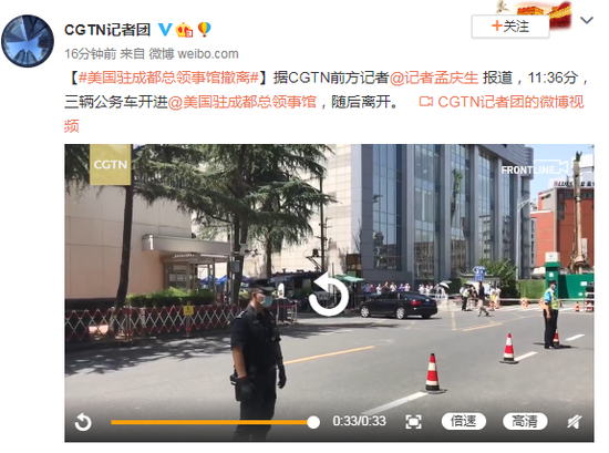 据CGTN前方记者@记者孟庆生 报道,11:36分,三辆公务车开进@美国驻成都总领事馆,随后离开。