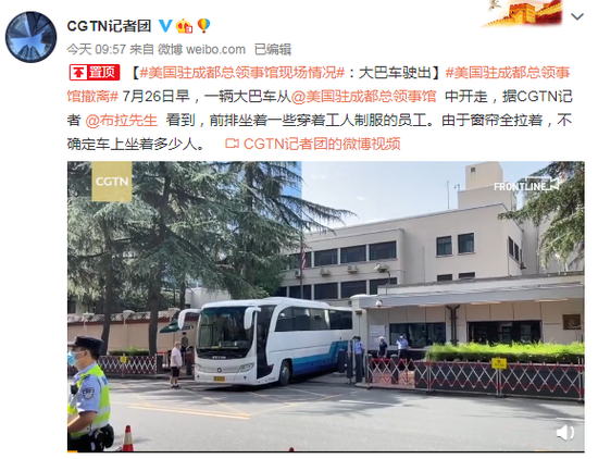 7月26日早,一辆大巴车从@美国驻成都总领事馆 中开走,据CGTN记者 @布拉先生 看到,前排坐着一些穿着工人制服的员工。由于窗帘全拉着,不确定车上坐着多少人。