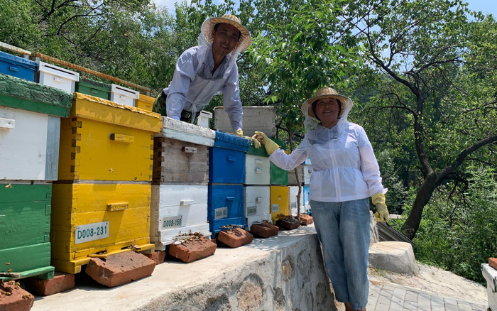 大暑之后,北京气温持续飙升到35℃以上,即使在远郊密云的大山里,仍能感觉出几分被太阳炙烤的灼烧感。好不容易等来大片云朵遮住灼热的光芒,戴着蜂帽、长衣长裤全副武装的田淑革站在蜂箱前长舒了一口气,“这云遮上来,立马就凉快了。”这是她和同是蜂农的丈夫王全生最惬意的时刻,夏天的风吹进太师屯镇龙潭沟村,不知道是不是因为毗邻密云水库的关系,阴凉处的风里总是带着些许清凉。