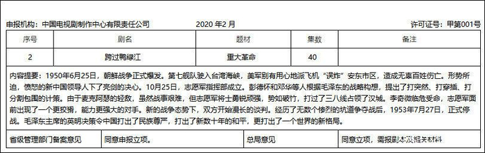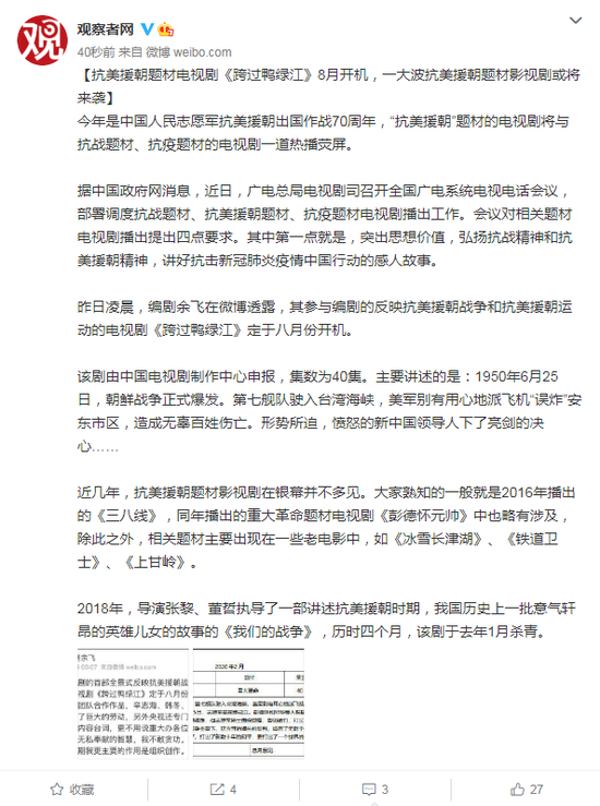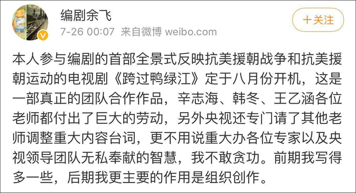 昨日凌晨,编剧余飞在微博透露,其参与编剧的反映抗美援朝战争和抗美援朝运动的电视剧《跨过鸭绿江》定于八月份开机。